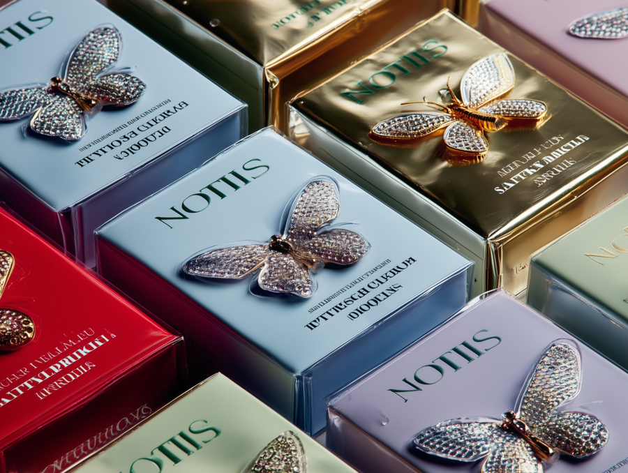 variety of jewelry packaging on a blue background for the jewelry shop «Notis», front view