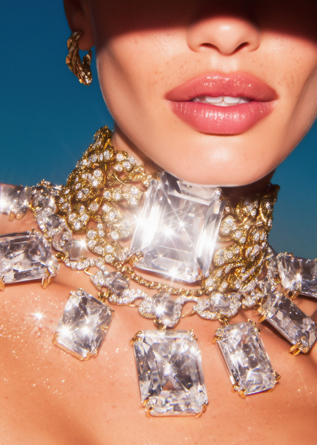 fashion magazine advertising jewelry, primary colors gold and blue, jewelry brand «Notis»
