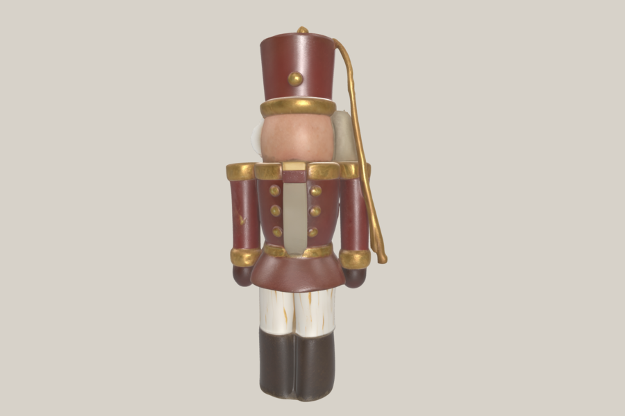2.1. Щелкунчик Материал: SLA-печать с последующей ручной отделкой под папье-маше. Высота: ~140 мм Ширина: ~40 мм Толщина стенок: ≥2,5 мм Цвета: бордовый мундир, золотые детали, тёплый коричневый для лица и рук Поверхность: слегка шероховатая, имитация ручной росписи Крепление: петля сверху для нитки Примечание: упрощённый монолитный силуэт, выразительные формы