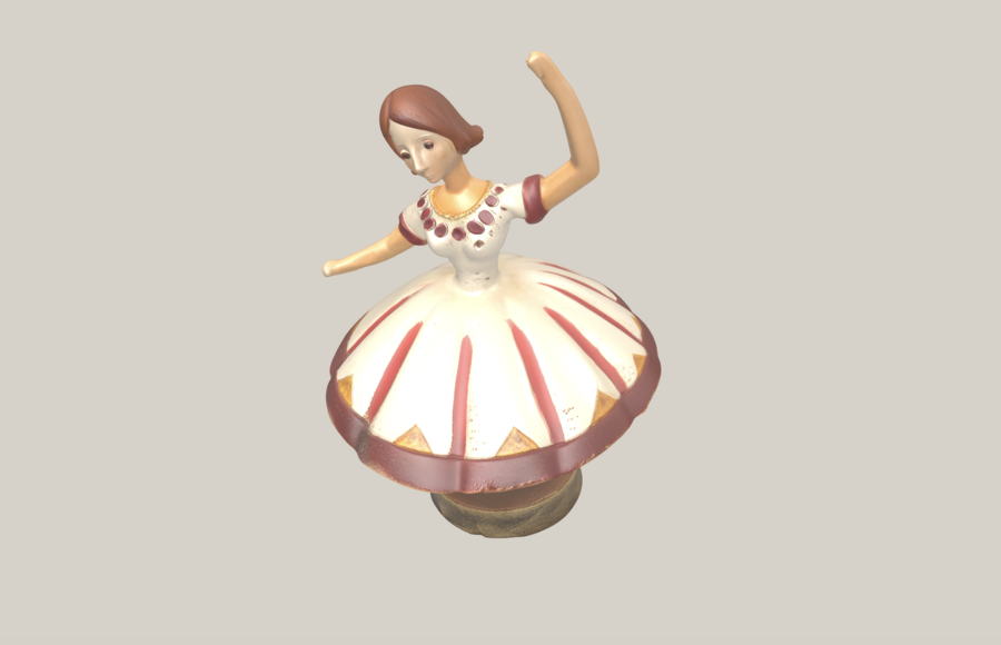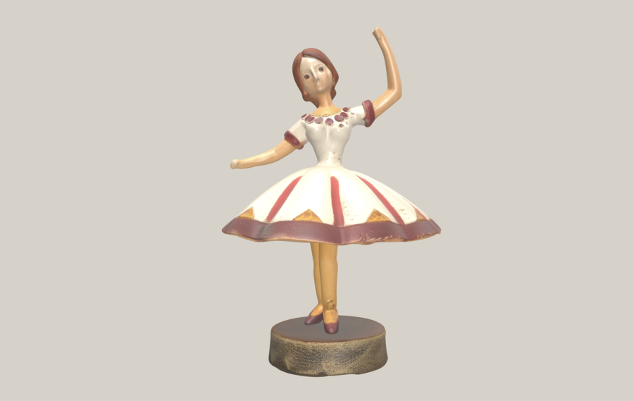 Сказочный 3D‑объект интерьера на подставке: Балетная Клара Упрощённая монолитная фигурка девочки в балетной позе, выразительный силуэт, стиль: старинная игрушка из папье‑маше, ручная работа, слегка шероховатая текстура, цвета: кремовое платье с бордовыми и золотыми акцентами, тёплые коричневые волосы, dynamic pose, graceful posture, elegant silhouette, теплый зимний свет, ощущение старого Нового года, isolated object, high quality render, studio lighting, soft shadows