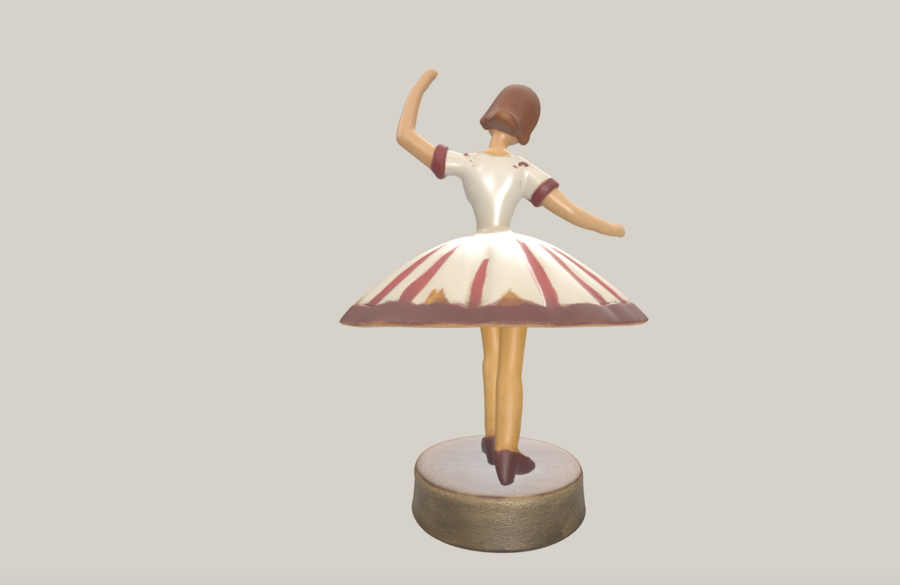 2.2. Фигурка Клары Материал: SLA-печать с последующей ручной отделкой под папье-маше. Высота: ~120 мм Цвета: кремовое платье с бордовыми и золотыми акцентами, тёплые коричневые волосы Форма: балетная поза, выразительный силуэт Поверхность: ручная роспись с эффектом винтажа Крепление: петля сверху