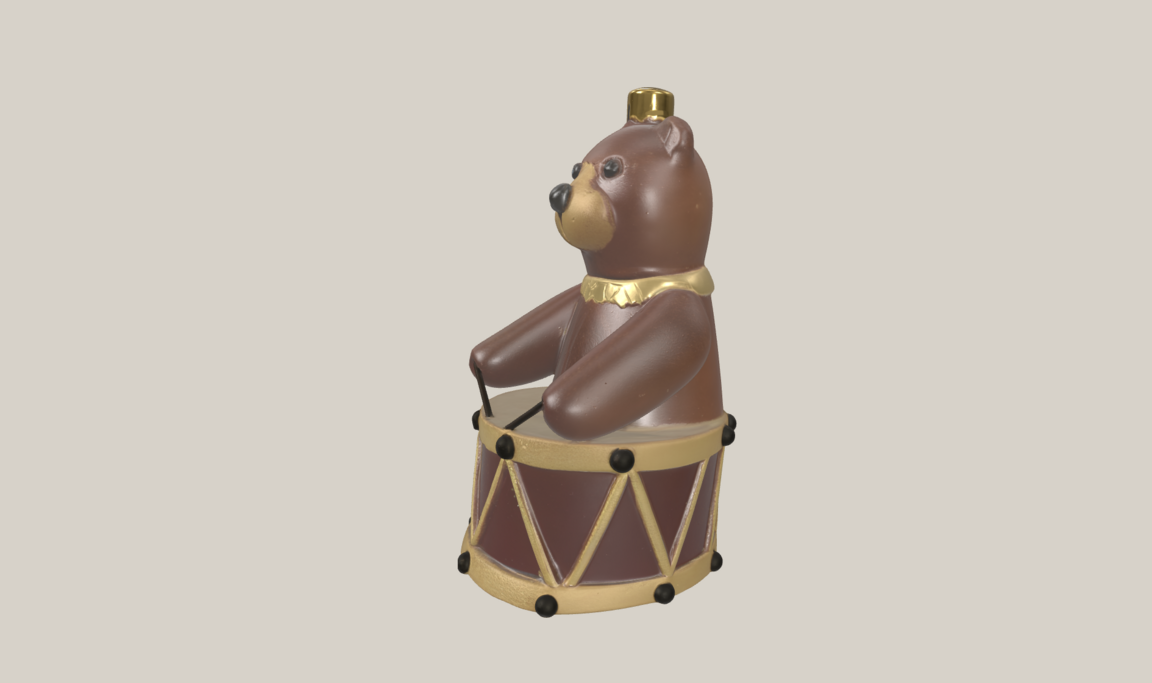 2.4. Мишка с барабаном Материал: SLA-печать с последующей ручной отделкой под папье-маше. Высота: ~110 мм Цвета: тёплый коричневый, бордовый барабан, золотые детали Форма: выразительный силуэт, наивный и праздничный характер Поверхность: ручная роспись с лёгкими неровностями Крепление: петля сверху