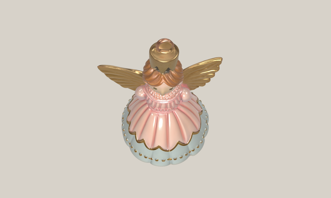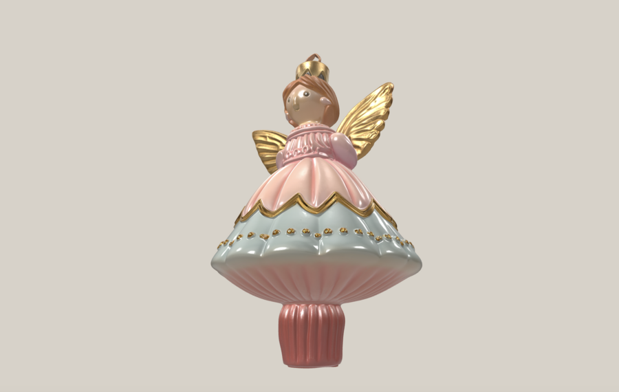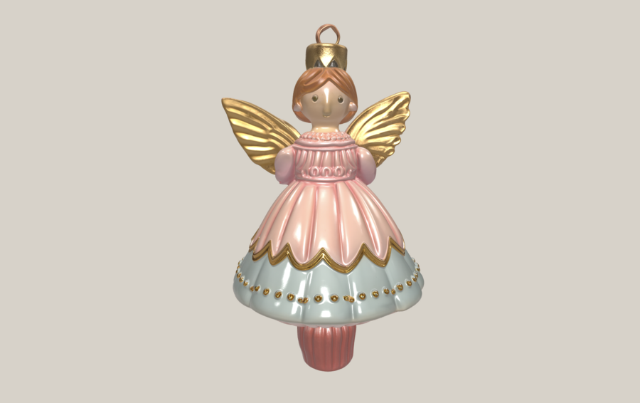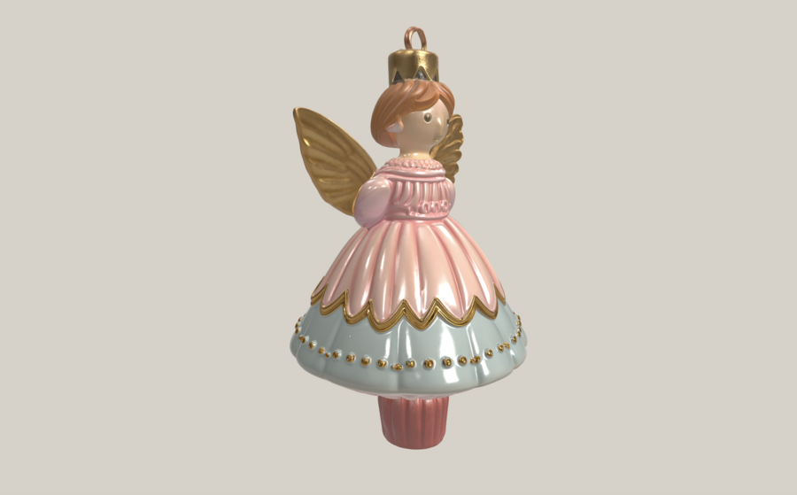 Сказочный 3D-объект интерьера: ёлочная игрушка «Фея Драже» Упрощённая монолитная фигурка феи, крылья в виде цельной формы, стиль: старинная ёлочная игрушка из папье-маше, ручная работа, цвета: пастельно-розовый, ледяной голубой, золотой, мягкое волшебное сияние, петелька для подвеса, теплый зимний свет, isolated object, high quality render, studio lighting, soft shadows