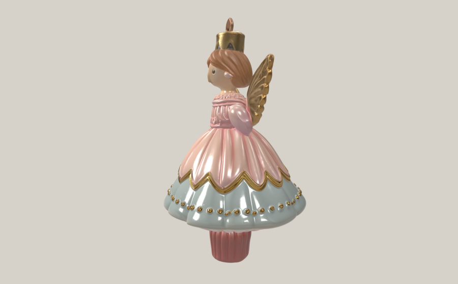 2.5. Фея Драже Материал: SLA-печать + покраска Высота: ~100 мм Цвета: пастельно-розовое платье с ледяными голубыми и золотыми акцентами, кремовые оттенки, мягкое перламутровое сияние Форма: крылья цельной формы, балетная поза Поверхность: гладкая, слегка перламутровая, ручная роспись Крепление: петля сверху