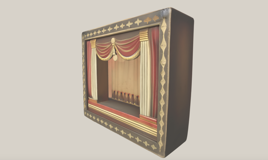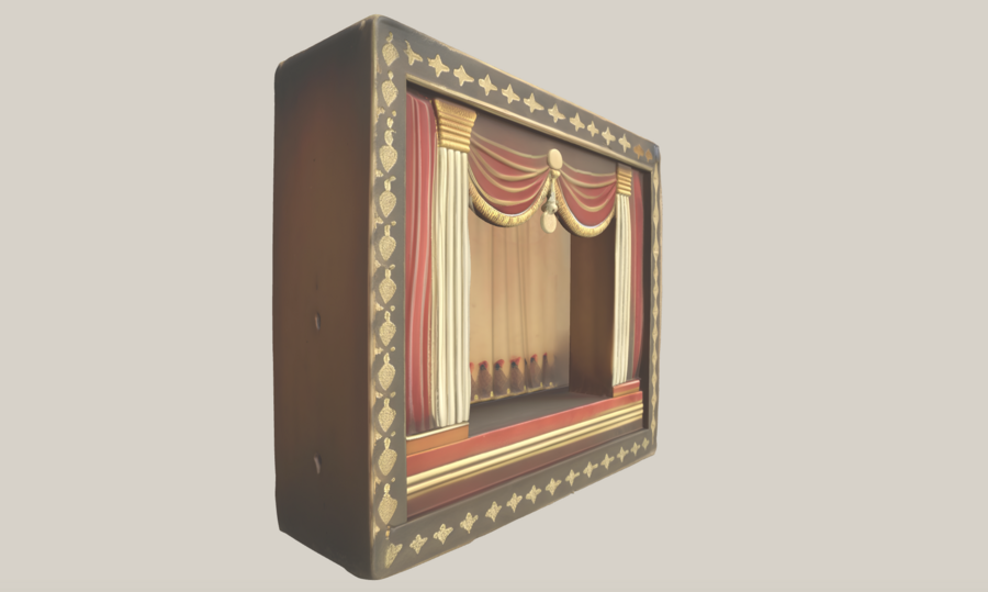 2.6. Коробка-сцена Материал: SLA, 3D-печать с последующей художественной отделкой, имитирующей дерево. Размер: ~180 мм ширина × 120 мм глубина × 140 мм высота Форма: мини-театр с кулисами и задником, ниша для всех пяти фигурок Цвета: тёплый коричневый корпус, бордовые кулисы, золотые акценты Поверхность: слегка состаренная текстура, ручная обработка Примечание: устойчивое основание для всех фигурок, декоративная театральная сцена