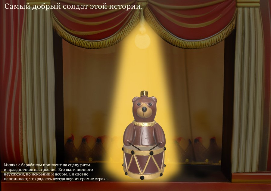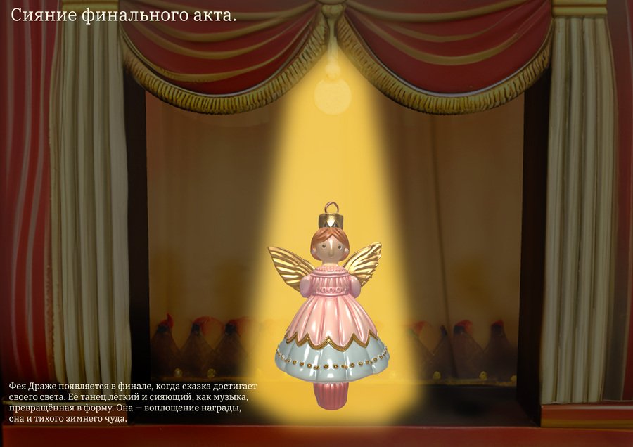 Главная задача коллекции: Создать цельный сказочный объект, который объединяет в себе ёлочные игрушки, интерьерную композицию и театральную сцену, передавая атмосферу старого Нового года и балета «Щелкунчик»