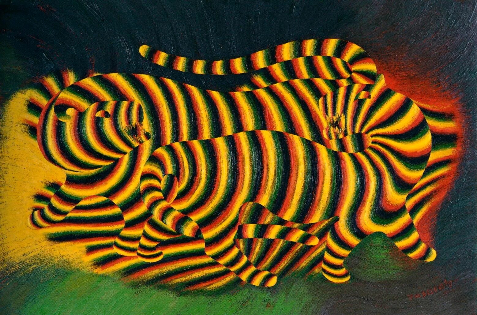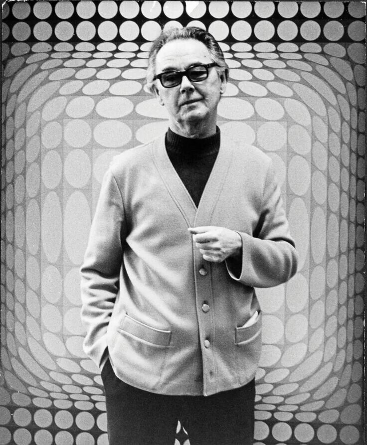 Виктор Вазарели (Victor Vasarely) — французский художник венгерского происхождения, которого часто называют «отцом оп-арта».[3] Именно Вазарели считают основоположником направления: начиная с 1930-х годов он экспериментировал с геометрическими узорами, цветом и оптикой, стремясь объединить искусство с наукой о восприятии. В 1960-е его работы представляли собой сложные сетчатые структуры, создающие дезориентирующие зрение эффекты — поверхности будто «вздуваются» или пульсируют.