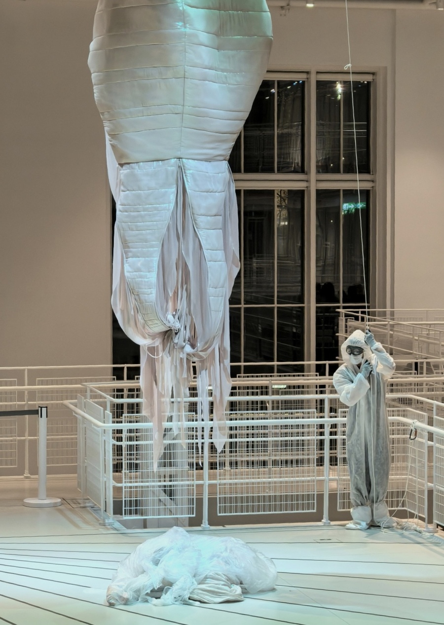 Сновидческая реальность перформанса КОКОН, где главная героиня проходит через причудливые трансформации, наполнена удивительными созданиями. Среди них — четырехметровый объект, чьи очертания напоминают кальмара или морского моллюска, выполненный из перламутрово-розовой ткани. Этот арт-объект служит прямой аллюзией на одну из первых коллекций Светланы под названием «Устрицы». Все костюмы персонажей взяты из архивных коллекций бренда, что создает эффект «сна наяву» и диалог между разными периодами творчества дизайнера.