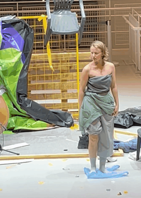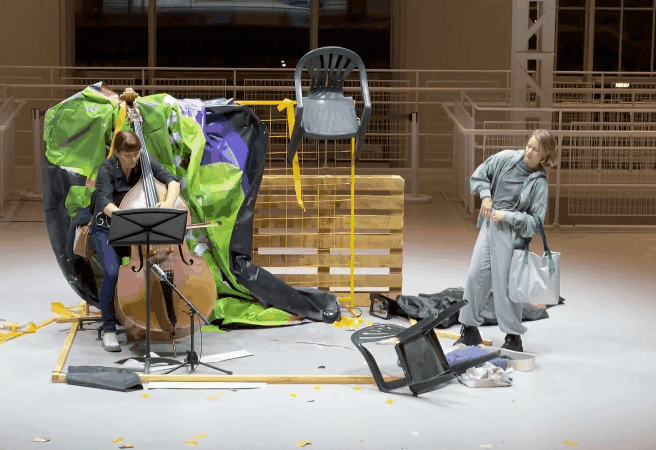 Представление раскрывало идею взаимодействия тела и одежды, в ходе танца одежда значительно трансформировалась. Танцхудожница прямо на сцене превращала обычные вещи в нарядное платье, используя подручные средства — ножницы и фантики. Поначалу она казалась обычной посетительницей ГЭС, не разобравшейся в происходящем. Однако когда началось звучание контрабаса и включились отрывки интервью, с которыми девушка активно взаимодействовала через хореографию, становится понятно, что перфоманс начался.
