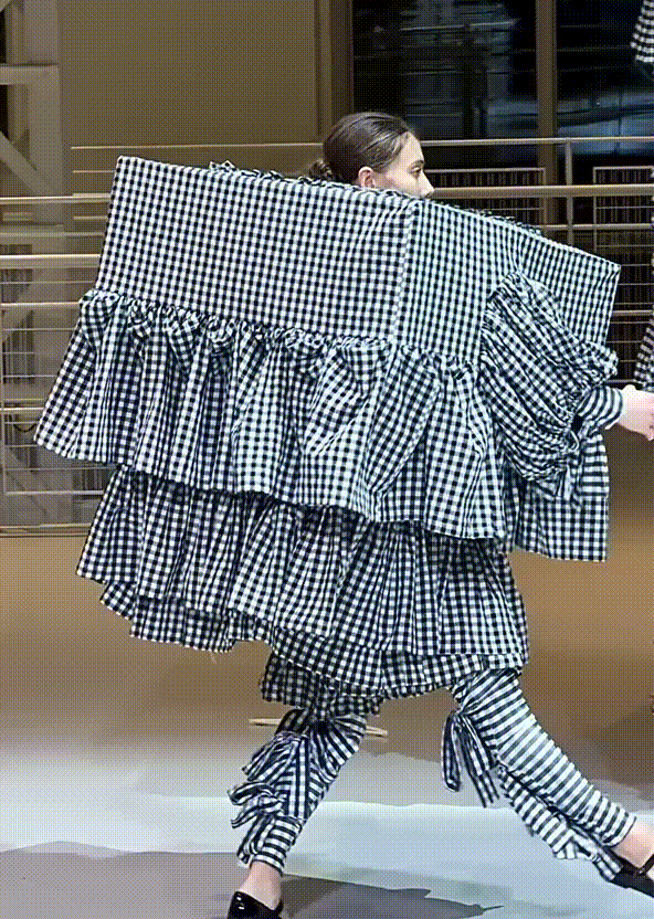 Несмотря на конструктивную легкость, в движении костюм показан тяжелым, героиня прогибается под одеждой, а каждый новый слой дается ей все с большим трудом.