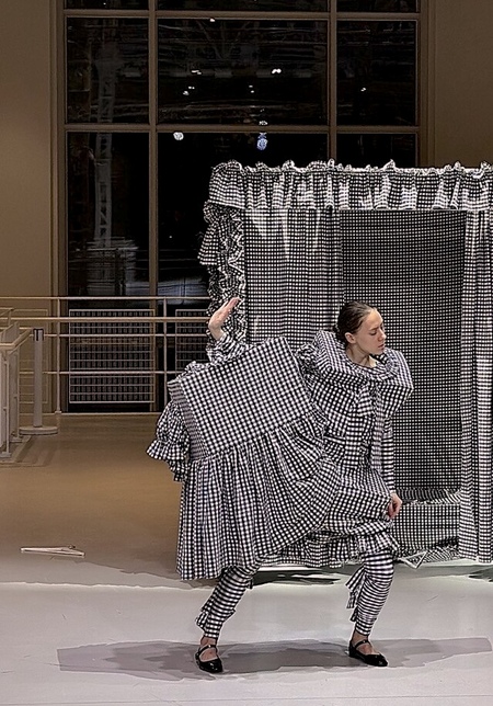 Серию перформансов завершает спектакль My safe space Романа Зимогорского — диалог дизайнера с аудиторией об уязвимости, тревожности и защитных функциях одежды в исполнении Дарьи Дерябиной.