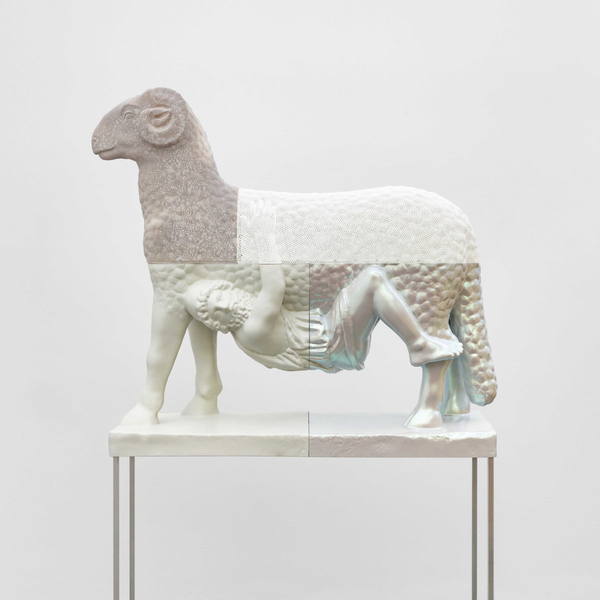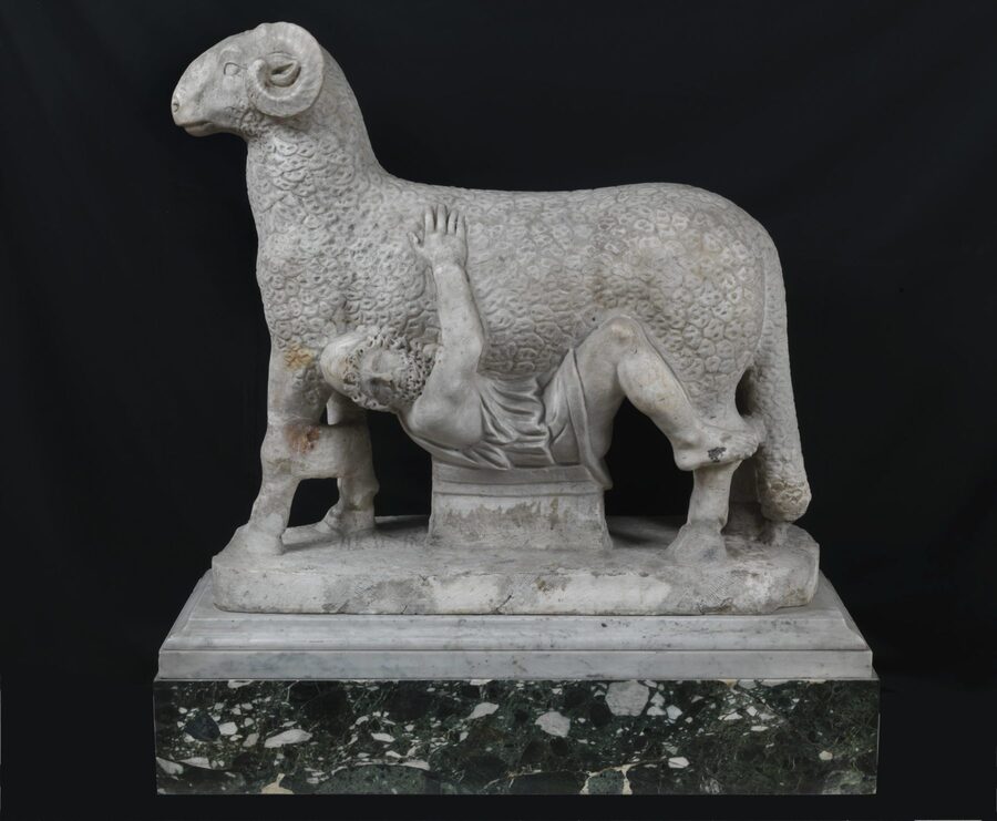 Слева: «Баран с человеком» (2021) // Оливер Ларик // Справа: «Одиссей, держащийся за барана» (2 век н. э.)