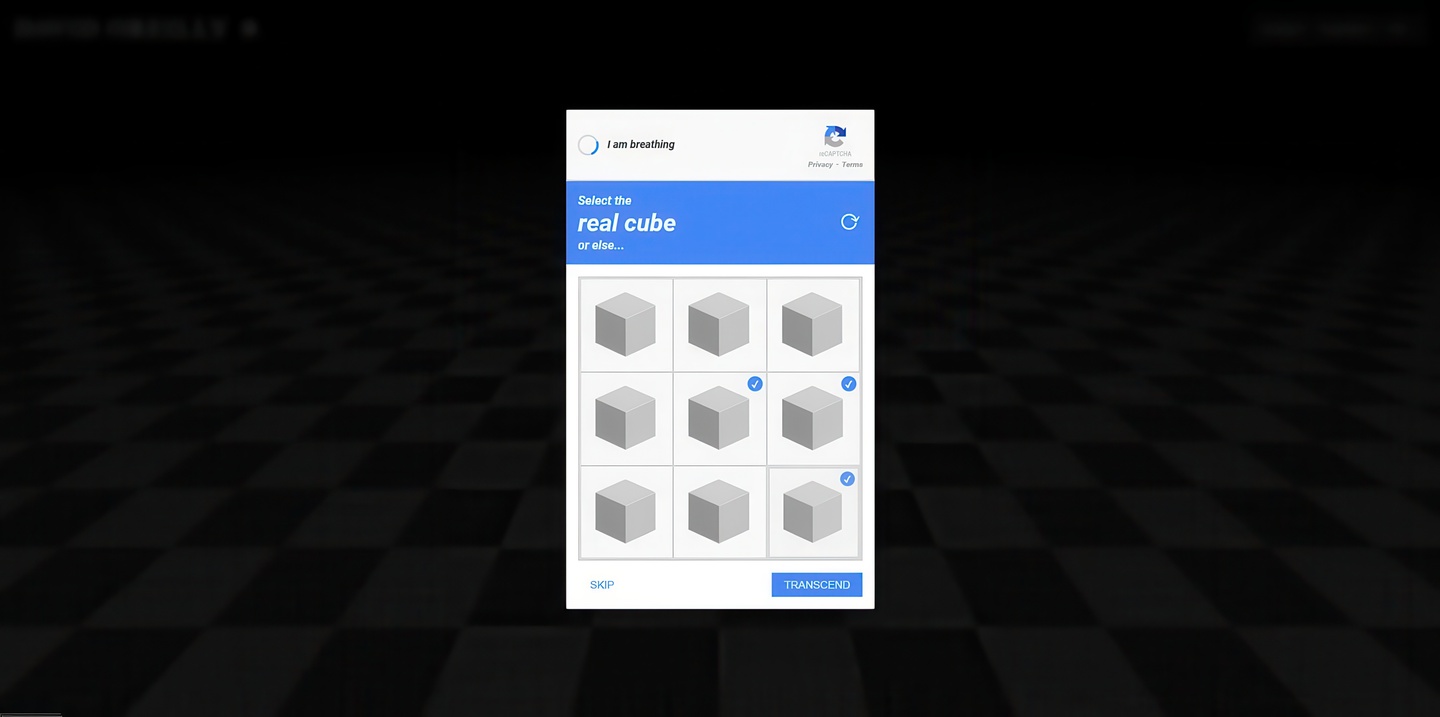 Заходя на его личный сайт, пользователь сталкивается с импровизированной, крайне абсурдной «капчей».Однако, до недавнего обновления, сайт выглядел иначе[6], но так же отсылал к «не-реальности» медиума сети, заставляя посетителя каждый раз задумываться над тем, что именно он видит в интернете. Сайт заверяет, что последнее обновление было 3 апреля 1999 года, а пользователь является 43 посетителем сайта. Оба этих факта не являются истинной.