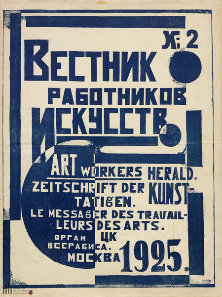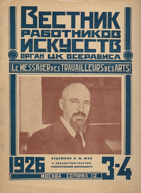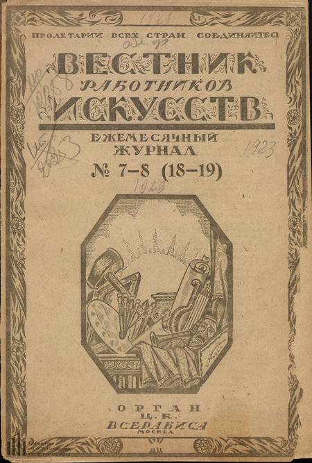 Интересно проследить изменения обложек «Вестника работников искусства». Журнал выходил ежемесячно с 1920 по 1926 год в Москве. В нём публиковались теоретические статьи по вопросам искусства, а также распоряжения и инструкции. Имелись отделы-хроники по советскому и зарубежному театру. Он предназначался как информационный и образовательный ресурс для новоиспеченных деятелей искусства.