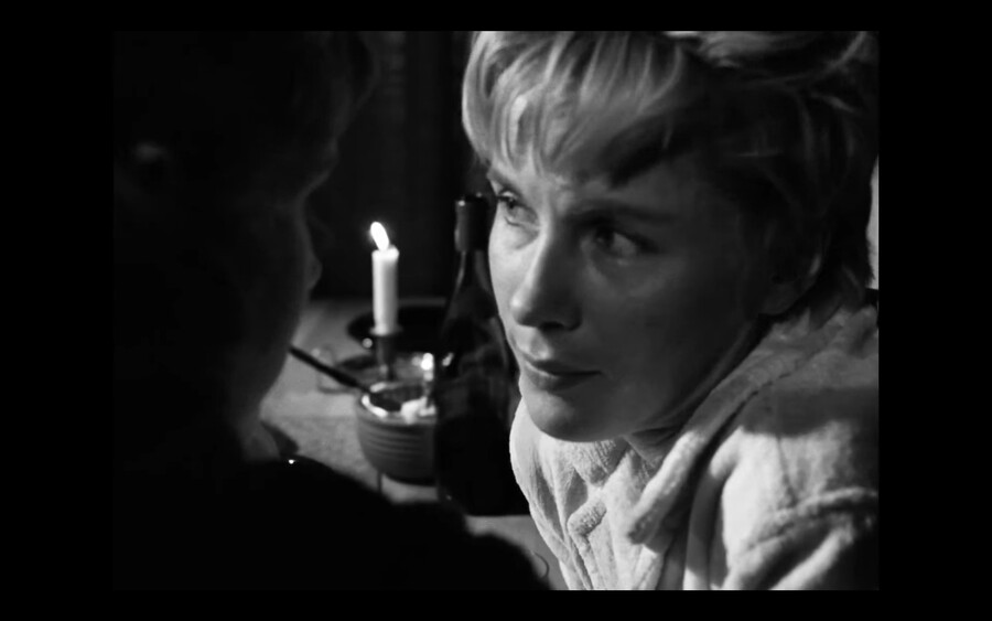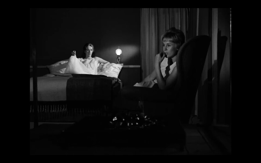 Медсестра заглядывает глубоко внутрь молчаливой Элизабет и говорит вместо нее. Героине-актрисе не удается скрыть свои нескрываемые внутренние муки, которые Бергман беспощадно захватывает в кадре.