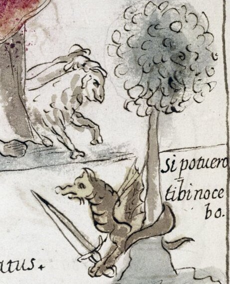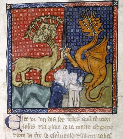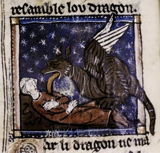 Дракон лижет человека, Французский Бестиарий, XIVв. // Дракон с мечом, «Пророчество римских пап», 1600 г, Италия // Книжная иллюстрация со сценой Апокалипсиса, 1315–1325 гг., Англия
