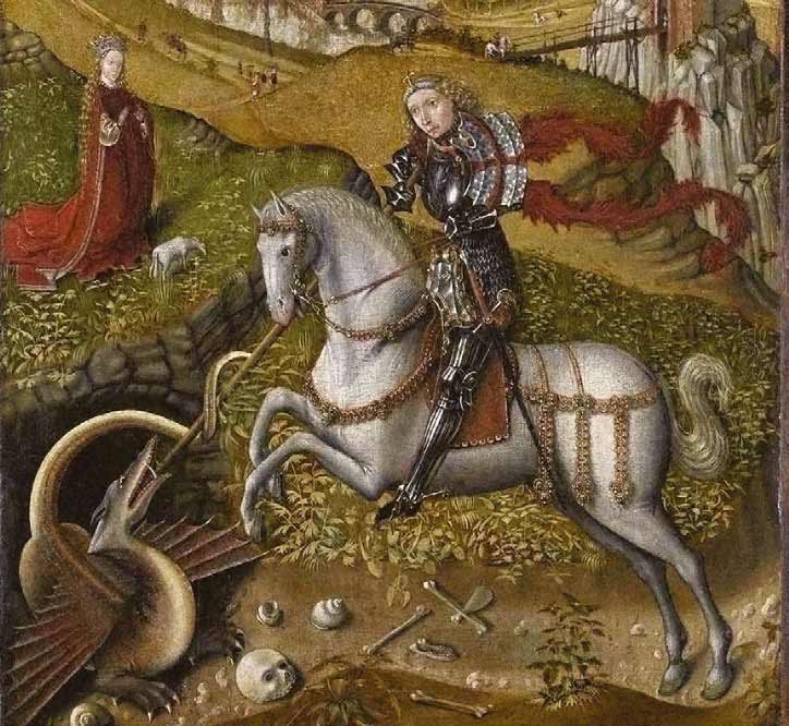 Битва святого Георгия с драконом, Паоло Уччелло, ок. 1456 г. // Святой Георгий побеждает дракона, Бернат Марторель, 1434–1435 гг. // Святой Георгий побеждает дракона, неизвестный художник XV в.