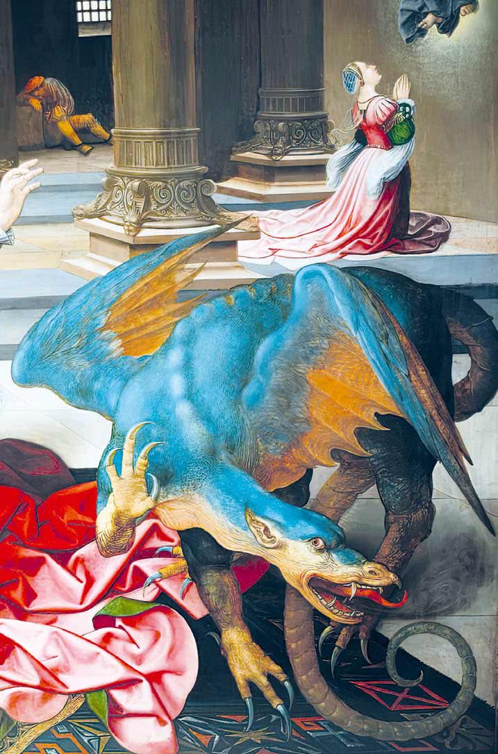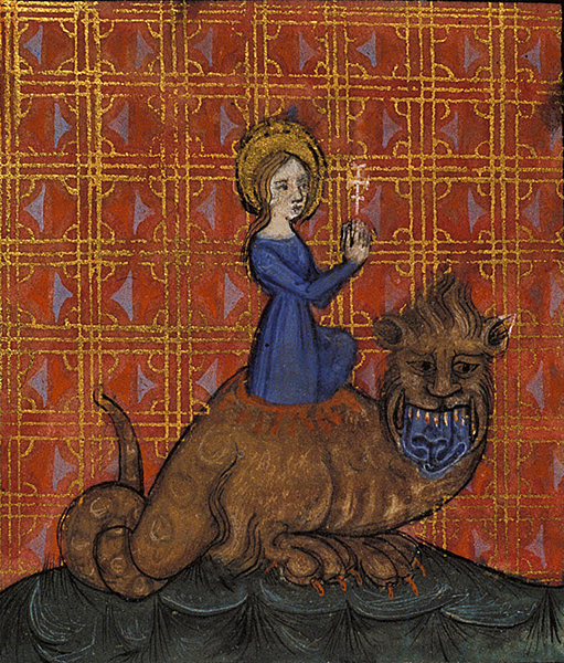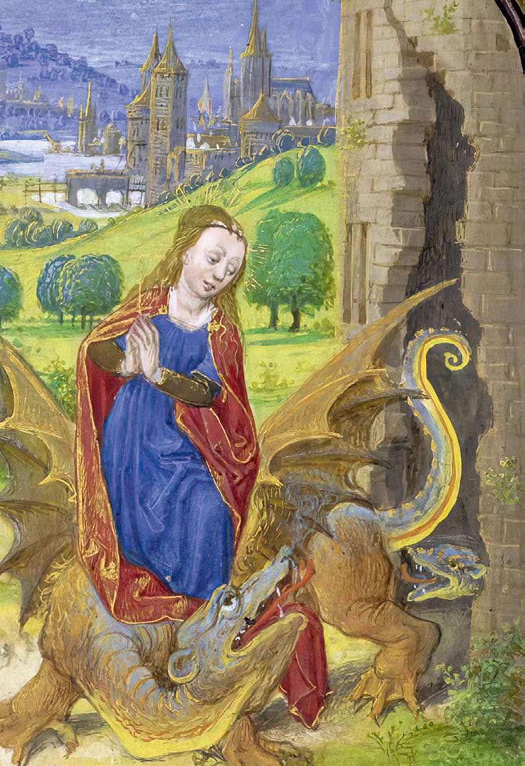 Миниатюра из манускрипта Якова Ворагинского «Золотая легенда», 1382 г., Франция // Маргарита Антиохийская в средневековом манускрипте // Дракон, побежденный Маргаритой, на картине Ян Ромбоут Старший