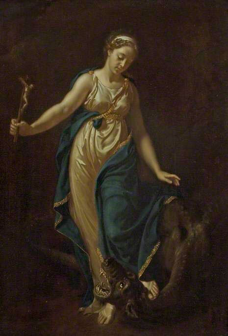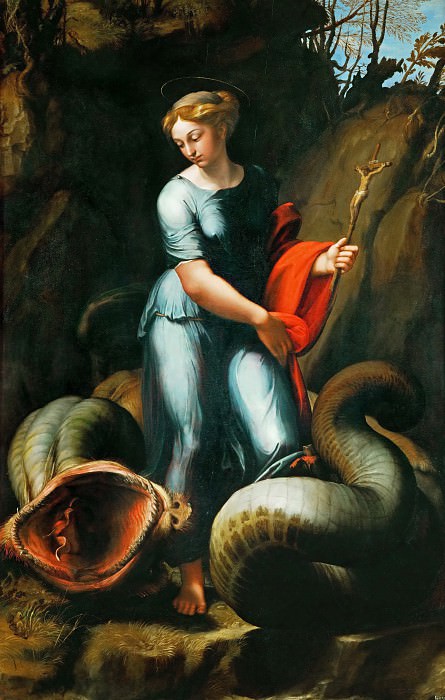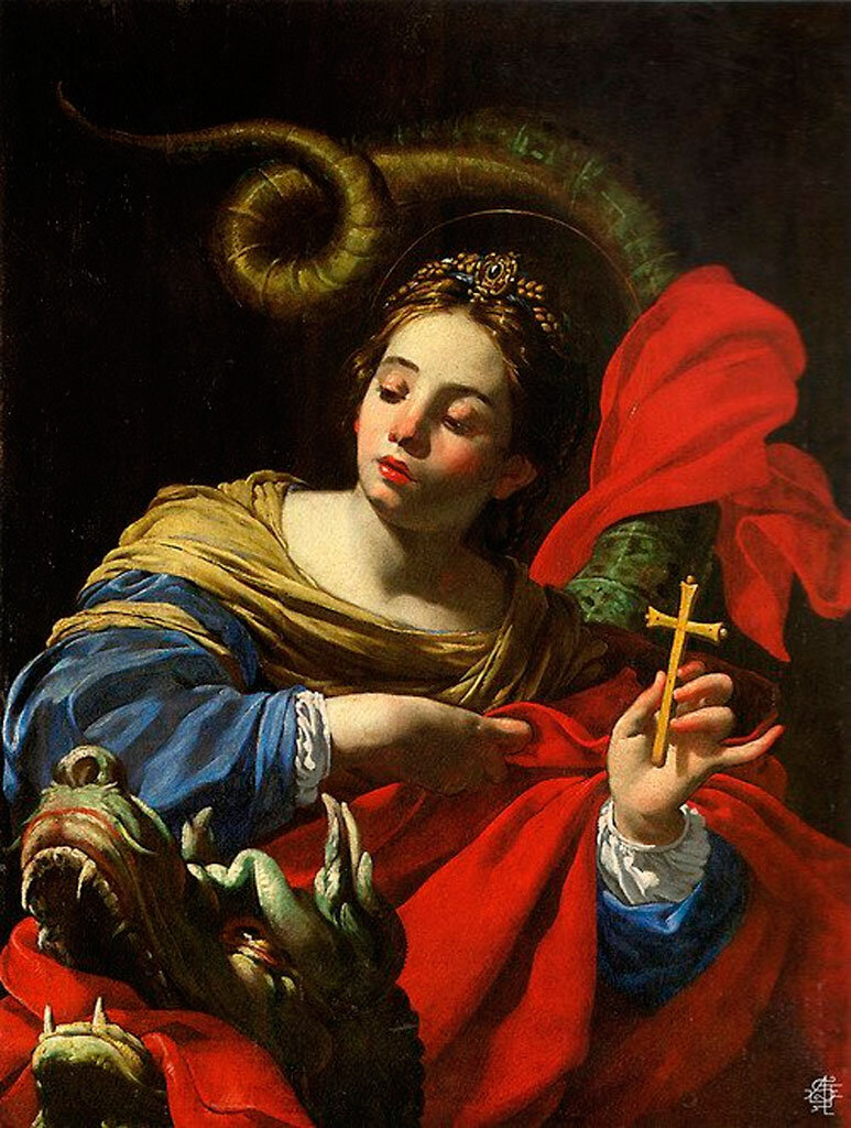 Если вы видите женщину с драконом, молящуюся или осеняющую дракона крестом, то перед вами — святая великомученница Маргарита Антиохийская. Девушка эта была весьма боевой и в разной традиции изображалась по-разному: в католической с драконом, в православной — на удивление, с молотком, забивающей им беса. Часто можно встретить изображение, где Маргарита либо вылезает из тела дракона, либо стоит в его кольцах — тогда узнать этот сюжет становится еще проще.