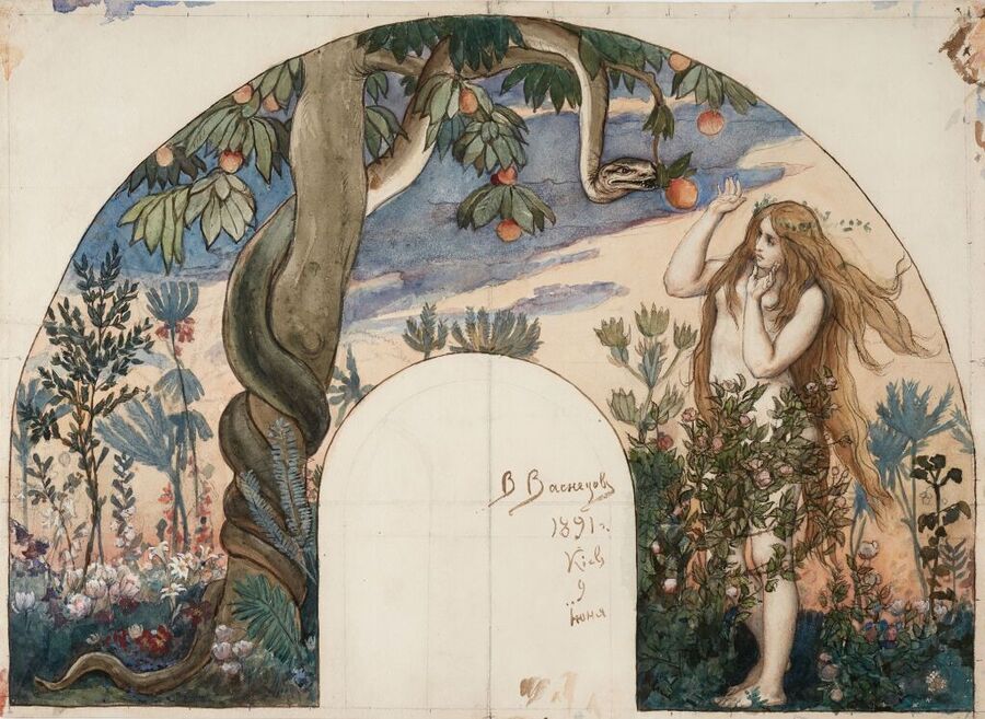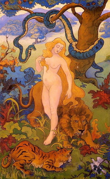 Грехопадение. Ева и змий, Виктор Васнецов, 1885–1896 гг. // Искушение, Уильям Стрэндж, 1899 г. // Ева в земном Раю, Поль Рансон, 1990-е г., Музей изящных искусств, Ренн, Франция