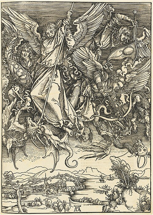 «И другое знамение явилось на небе: вот, большой красный дракон с семью головами и десятью рогами, и на головах его семь диадем», Откровения Иоанна Богослова 12: 7-12.