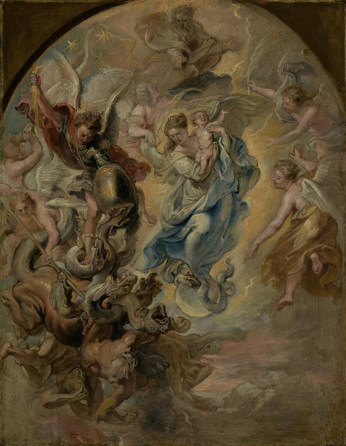вятой Михаих сражается с драконом, Альбрехт Дюрер, 1498 г. // Дева Мария — Жена, облечённая в солнце, Питер Пауль Рубенс, 1623–1624 гг. // Семь голов Мартина Лютера, карикатура, Ханса Бросамера, 1529 г