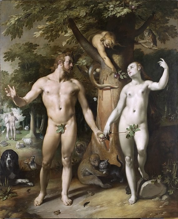 Грехопадение, Корнелис ван Харлем, 1592 г. // «Грехопадение и изгнание из рая», фреска, Микеланджело Буонарроти, 1508–1512 гг., Сикстинская капелла в Ватикане.