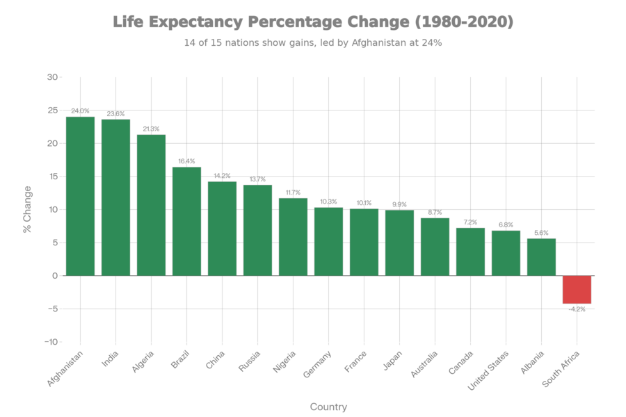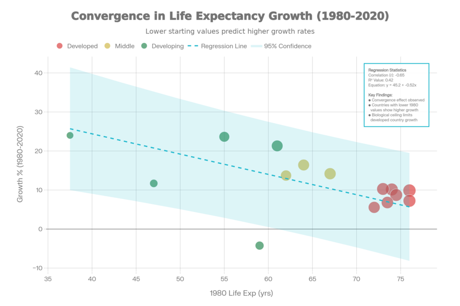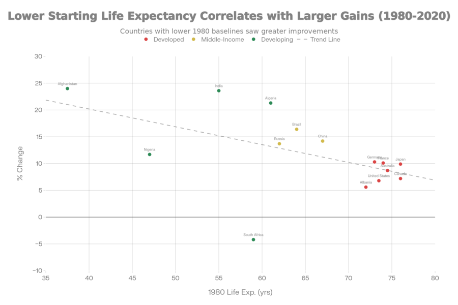 Парадокс конвергенции: Развивающиеся страны растут быстрее в процентах (Афганистан +24%), но абсолютный разрыв остается (~20 лет)