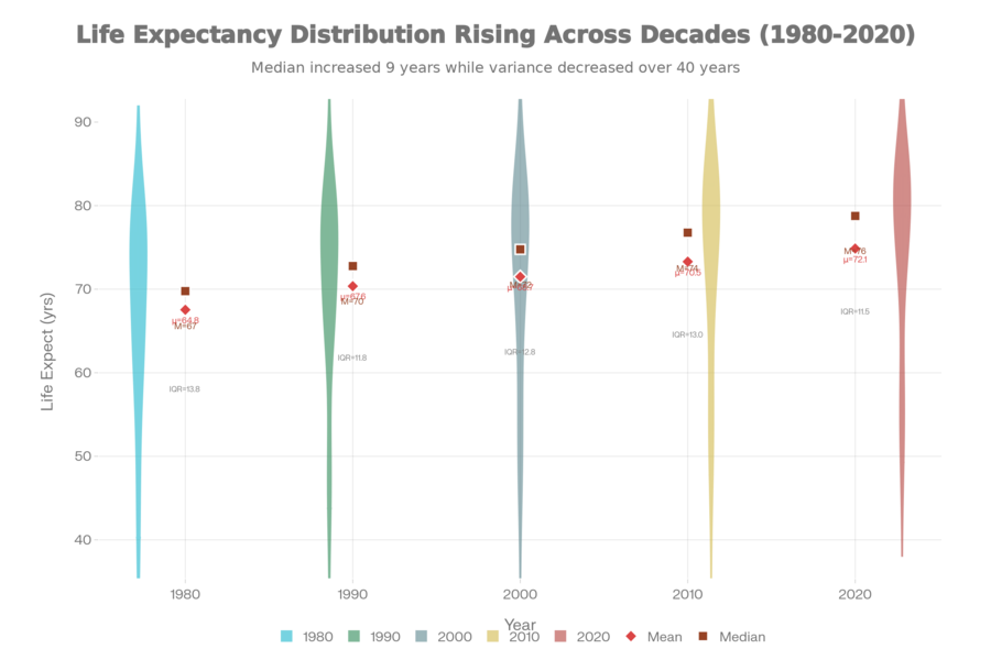 Комплексный анализ мировой ожидаемой продолжительности жизни (1980-2020): Интерактивная инфографика с хитмапом, распределением, трендами роста и квартильным анализом.
