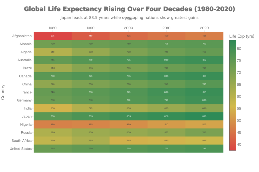 15 стран: Афганистан, Албания, Алжир, Австралия, Бразилия, Канада, Китай, Франция, Германия, Индия, Япония, Нигерия, Россия, Южная Африка, США 5 временных периодов: 1980, 1990, 2000, 2010, 2020 Всего 75 записей: 15 стран × 5 периодов Основной показатель: Ожидаемая продолжительность жизни в годах