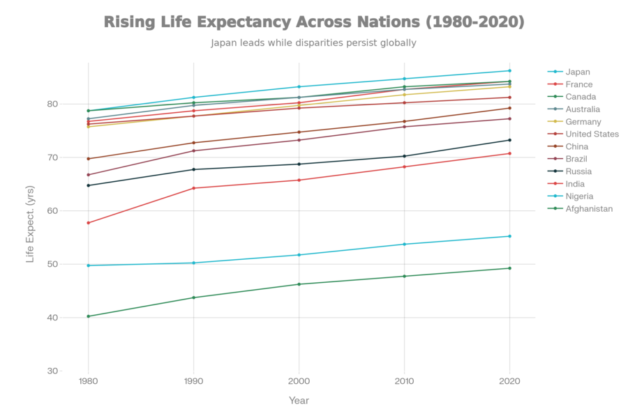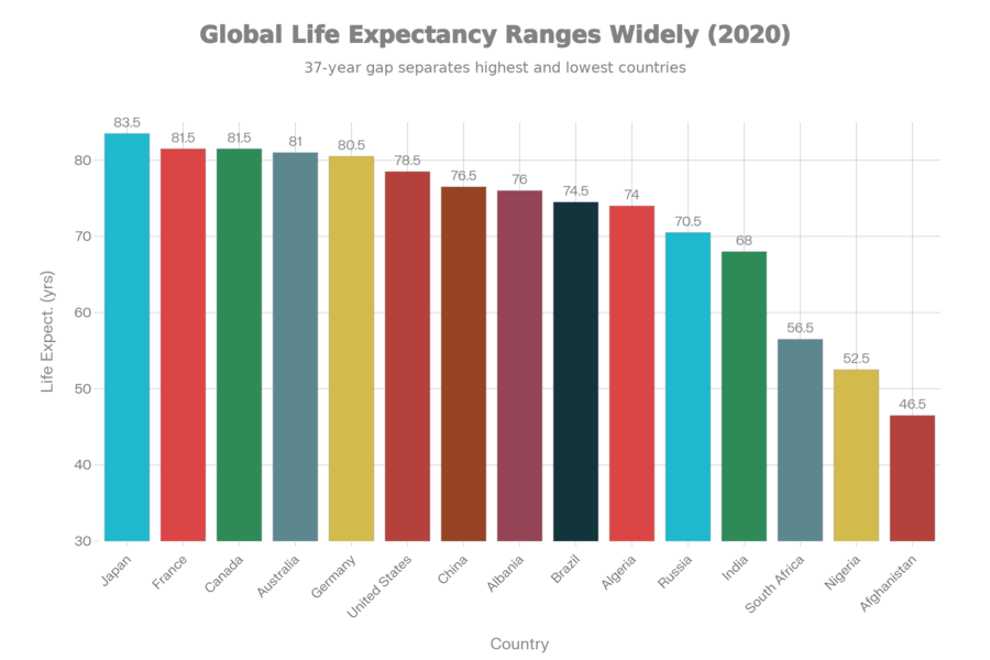 Япония лидирует с показателем 83.5 года, развивающиеся страны демонстрируют наибольший прогресс.