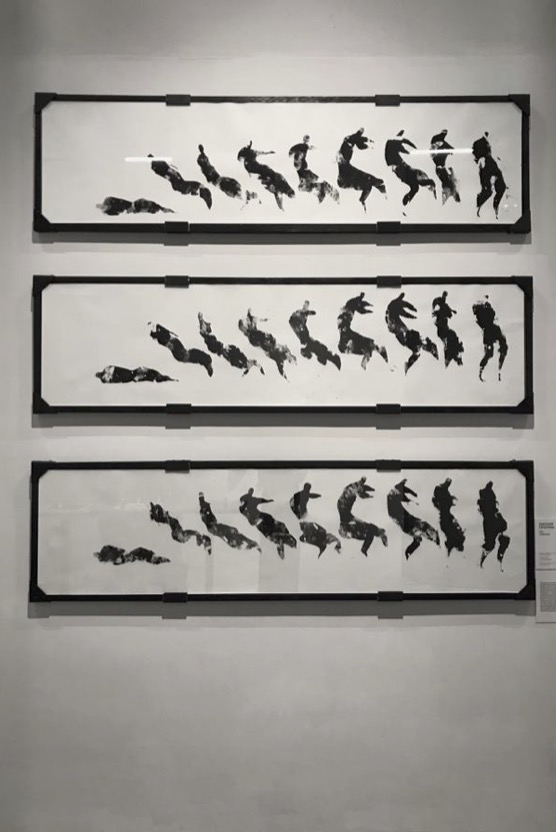Формально мы наблюдаем за тем, как человек падает «на наших глазах». Однако, следуя правилу чтения слева направо, сначала мы видим лежащего человека, и только потом можем осознать логику произошедшего. Процесс падения показан покадрово. Здесь время, как бы замедляясь, позволяет увидеть то, что недоступно обычному взгляду. Способ изображения-отсылка к Мейбриджу, который с помощью серий снимков изучал движения людей и зверей. С помощью множества снимков он сумел запечатлеть сложную систему движения. Работа отсылает к восприятию и влиянию медиа. Так, согласно исследованию Маршалла Маклюэна, описанного им в книге «Понимание медиа», кино, предвестником которого стали фотографии Мейбриджа, является горячим способом коммуникации, которое поглощает внимание зрителя, не давая ему пространство для собственного суждения. Напротив-графика наряду с рукописями является холодным способом коммуникации. Она позволяет зрителю активно участвовать в процессе, выносить свои суждения и выражать критическое мнение.