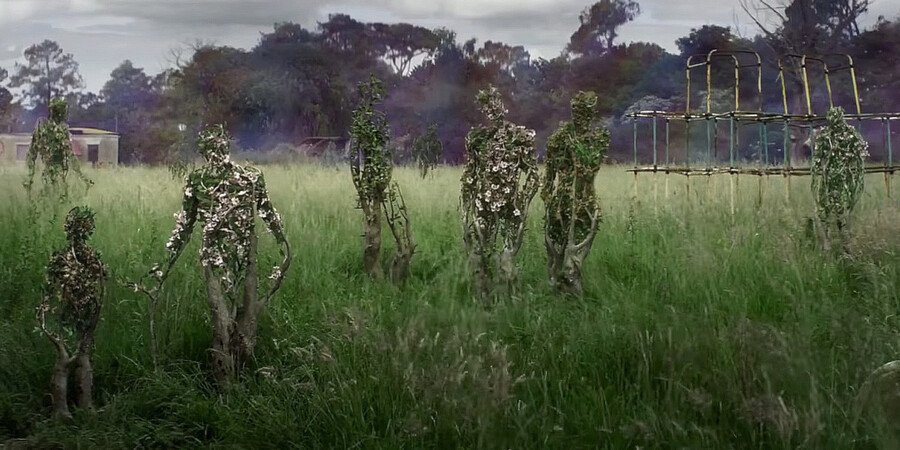 На третьем изображении растительные фигуры, повторяющие человеческие силуэты, демонстрируют, как зона сохраняет и воспроизводит память о людях, превращая их образы в биологические копии.
