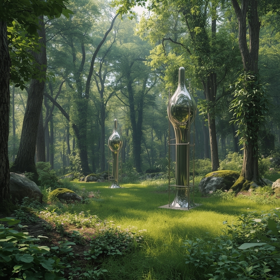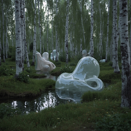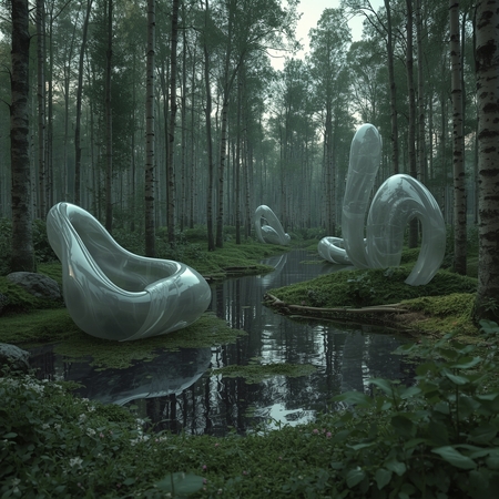 2)Hyper-realistic photographic render of a surreal, overgrown park in the avant-garde, Dadaist style of Francis Picabia. The scene is densely packed with tall birch trees, mossy ground, wildflowers, and lush undergrowth. Scattered throughout the forest are futuristic art installations — smooth, flowing, translucent glass-like structures with organic, biomorphic curves, resembling draped fabric or frozen liquid. These objects appear weightless and ethereal, partially submerged in shallow water or resting on grassy mounds. Their surfaces reflect and refract the surrounding trees and sky, creating dreamlike distortions. Soft, diffused twilight lighting enhances the mystical atmosphere. Style: photorealistic yet deeply surreal — blending nature with abstract, mechanical-poetic forms reminiscent of Picabia’s «mechanical portraits» and his fascination with fluid, ambiguous shapes. No humans, no text, cinematic depth of field, ultra-detailed, 8K.