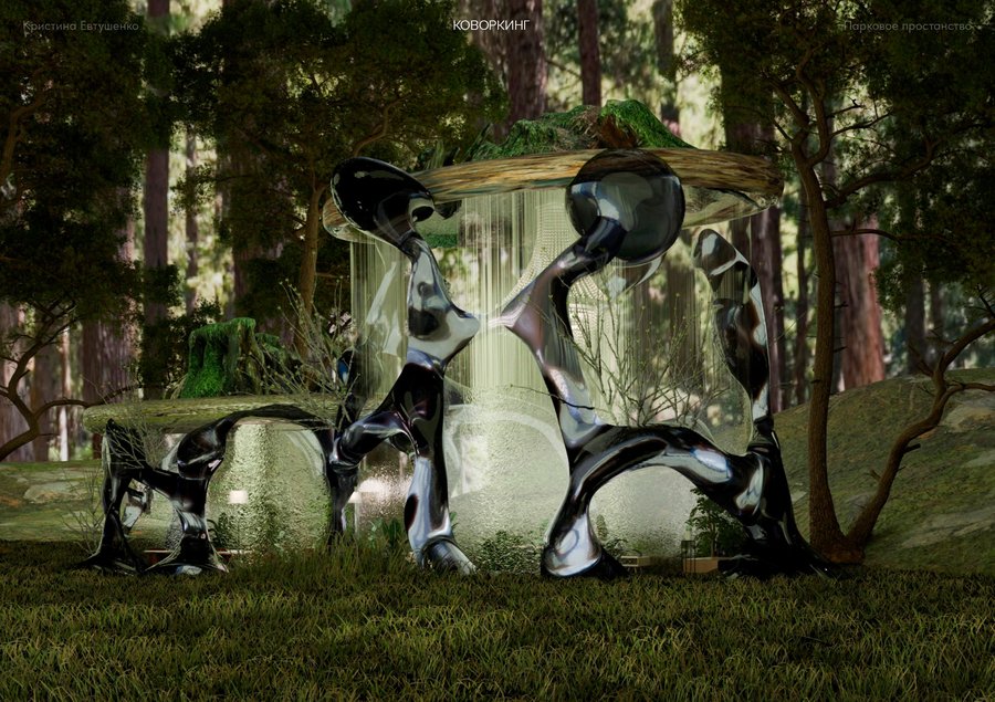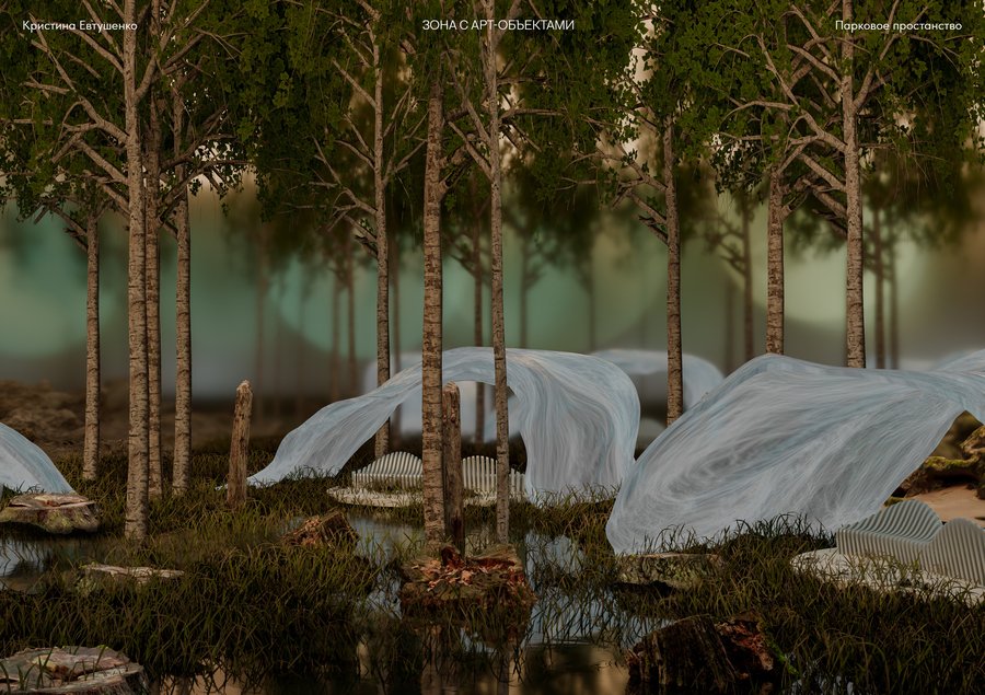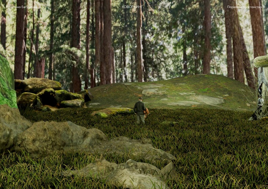 В первом слайдере изображены некоторые рендеры из моего проекта, а во втором — сгенерированные изображения зон, повторяющих настроение парка, и магазинчик.