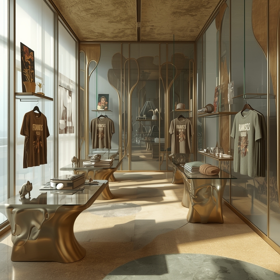 2)Hyper-realistic interior photograph of a surreal, avant-garde merch boutique designed in the Dadaist style of Francis Picabia. The space is bathed in soft, diffused natural light filtering through large windows. Walls and ceiling feature layered shades of green — mossy, sage, olive, and translucent emerald — with textured plaster and subtle wood accents. The floor is covered in a lush, living moss carpet — thick, velvety, and slightly uneven, with tiny sprouts and dewdrops catching the light. Floating display tables and sculptural shelves are made of liquid mercury-like metal and translucent glass, with biomorphic curves that appear to drip or melt into the environment. Clothing items — t-shirts, hoodies, caps — hang on minimalist hangers or drape over the metallic surfaces; each garment is rendered in earthy tones — warm ochres, dusty browns.