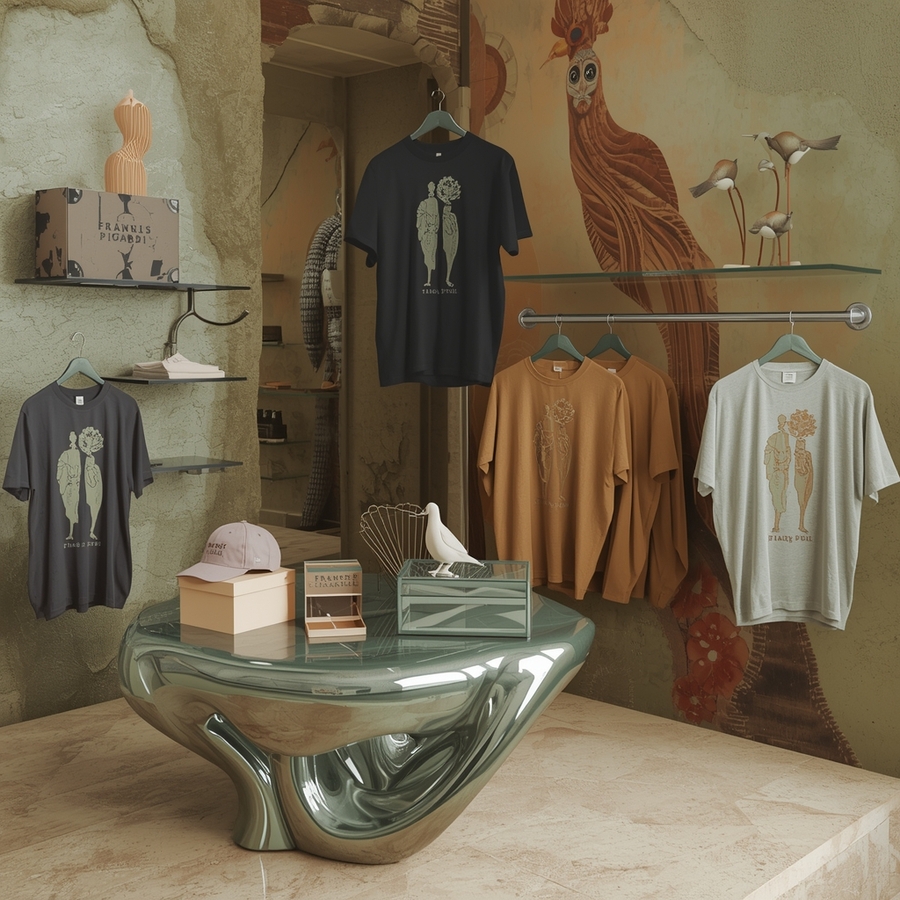 промты: 1)Hyper-realistic interior photograph of a surreal, avant-garde merch boutique designed in the Dadaist style of Francis Picabia. The space is bathed in soft, diffused natural light filtering through large windows. Walls are constructed from frosted matte glass panels with embedded liquid metal accents — flowing, organic ribbons of mercury-like material that appear to drip or fuse with the architecture. Floors and ceiling feature warm earth tones — mossy greens, ochre yellows, and dusty browns — with textured plaster and wood inlays. Floating display tables and sculptural shelves are made of translucent glass and reflective liquid metal, with biomorphic curves that seem to melt into the environment. Clothing items — t-shirts, hoodies, caps — hang on minimalist hangers or drape over the metallic surfaces; each garment prominently features the text «fransis picabia» printed in a hand-drawn, slightly distorted lowercase font, rendered in muted brown or sage green, integrated into abstract compositions of stylized human figures or floral motifs inspired by Picabia’s work.