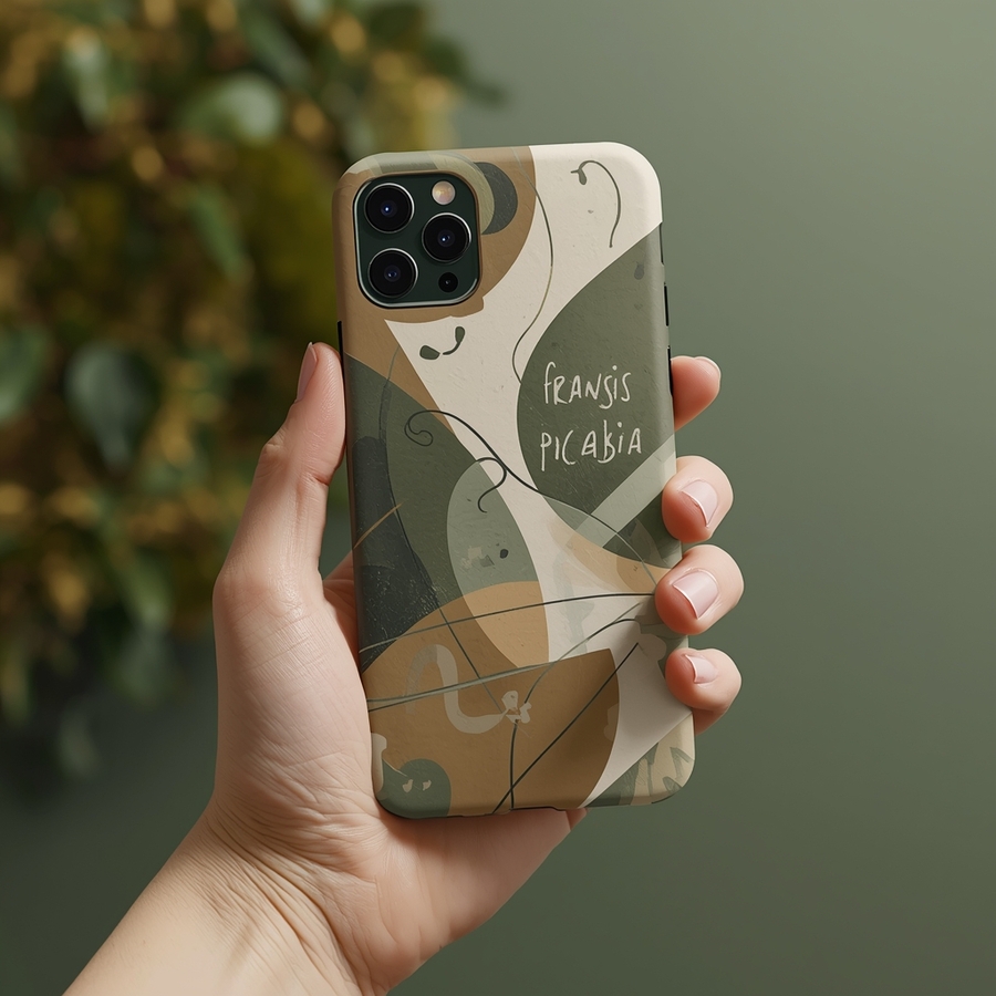 All items display original artwork inspired by Picabia’s mechanical-poetic universe: abstract yet recognizable forms including stylized human silhouettes, poetic botanical elements (flowers, leaves, stems), and flowing biomorphic shapes — rendered with hand-drawn lines, layered transparency, and subtle liquid-metal reflections. The compositions avoid literal realism but remain visually legible, blending organic and machine-like ambiguity.