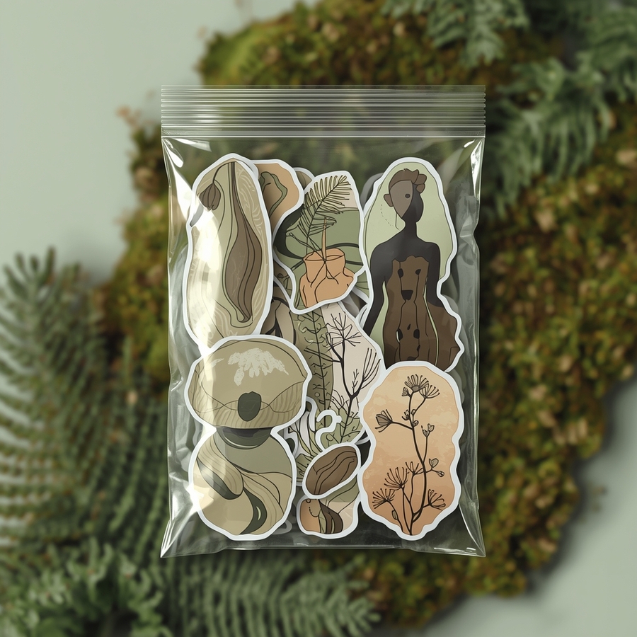 промт: *A cohesive series of photorealistic product mockups in the surreal, Dadaist style of Francis Picabia, featuring: — a white cotton t-shirt, — a hardcover art book, — a natural linen tote bag, — a set of transparent stickers inside a resealable zip-lock bag, — and an iPhone 16 case.