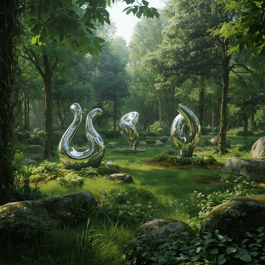 парк: 1)Create a hyper-realistic photographic render of a lush, overgrown park in the surrealist, mechanical aesthetic of artist Francis Picabia. The scene must be densely packed with vibrant greenery — tall trees, thick grass, wildflowers, moss-covered rocks, and climbing vines. Amidst the natural environment, place futuristic art installations made of liquid metal and translucent glass — sculptural, biomorphic forms that appear both organic and mechanical, reflecting their surroundings like polished chrome or mercury. These objects should resemble abstract, fluid machines or alien organisms, echoing Picabia’s «mechanical portraits» and Dadaist absurdity. Use soft, diffused forest lighting to enhance realism and mood. The final image should feel like a dreamlike collision between nature and avant-garde futurism — photorealistic yet deeply surreal.