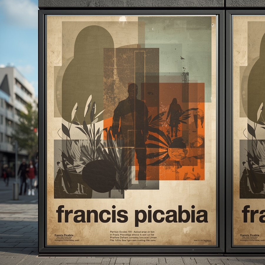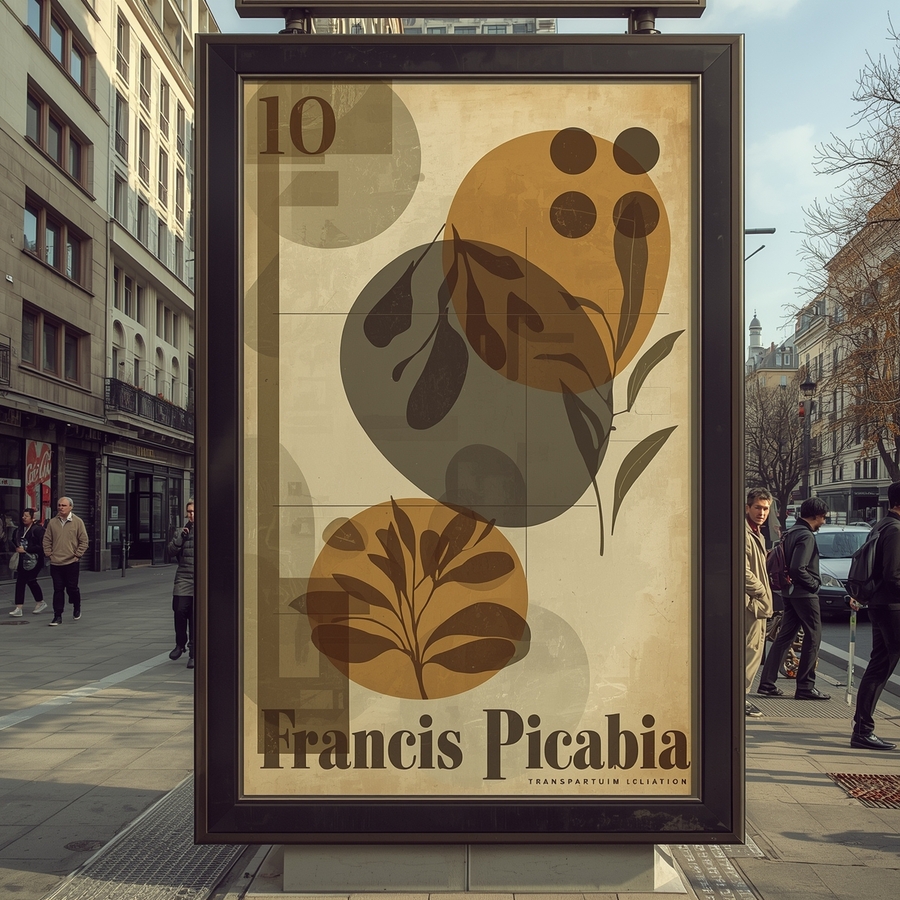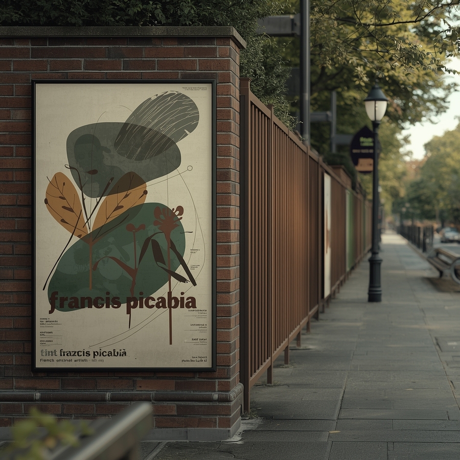 промт: Photorealistic mockup of outdoor street posters and banners in the surreal, avant-garde style of Francis Picabia, displayed on urban walls, park fences, and lampposts. The designs feature abstract yet evocative compositions: flowing biomorphic shapes, fragmented human silhouettes, and poetic botanical forms (stylized leaves, stems, flowers) — all rendered with hand-drawn lines, layered transparency, and subtle liquid-metal reflections. Color palette is strictly muted and earthy: sage green, moss, ochre, beige, dusty brown, and cool gray — with green as a unifying accent across all pieces. Each poster prominently includes the text «fransis picabia» in a distorted, lowercase hand-drawn font, integrated into the artwork (not overlaid). Additional typographic elements provide minimal biographical context — e.g., «French avant-garde artist • Dada • 1879–1953» — set in a clean, thin sans-serif that contrasts gently with the organic forms.