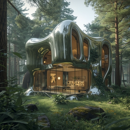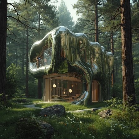 магазин: Hyper-realistic photographic render of a surreal, two-story boutique shop nestled deep within a lush, overgrown forest park. The building is designed in the avant-garde, Dadaist aesthetic of Francis Picabia — featuring a transparent glass base with fluid, biomorphic forms made of liquid mercury-like metal that appear to drip, flow, and merge with the structure. The architecture is organic and asymmetrical: curved walls, melted edges, and reflective surfaces that distort the surrounding trees and sky. The upper floor is partially visible through translucent panels, with soft interior lighting glowing like a lantern. The shop is surrounded by dense vegetation — tall pine trees, wildflowers, moss-covered rocks, and vines climbing the metallic façade. Soft dappled sunlight filters through the canopy, creating dreamlike shadows. Style: photorealistic yet deeply surreal — blending nature with mechanical-poetic abstraction, echoing Picabia’s fascination with ambiguous, machine-like forms. No signage, no text, cinematic composition, ultra-detailed, 8K resolution.
