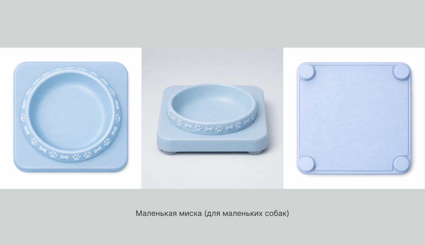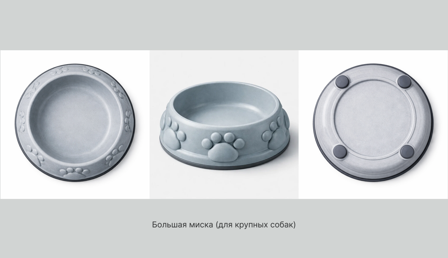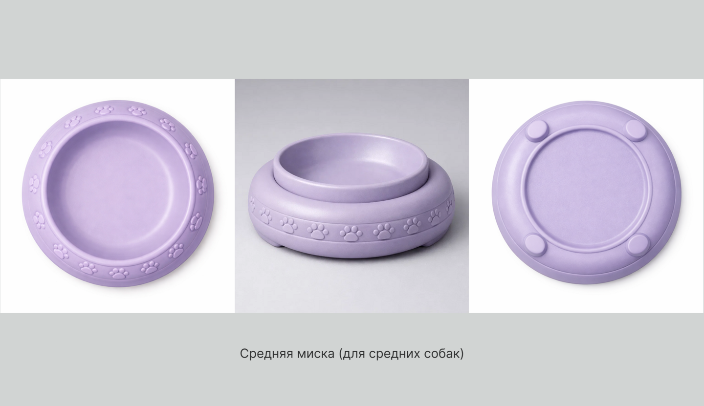 Серия построена как единая система из трёх размеров — для маленьких, средних и крупных собак. Пропорции и высота адаптируются под разные породы, сохраняя общий характер: низкий центр тяжести, широкое основание, отсутствие острых граней. Углублённая посадка чаши помогает удерживать корм в пределах миски, а расширенная база снижает риск сдвига во время еды.