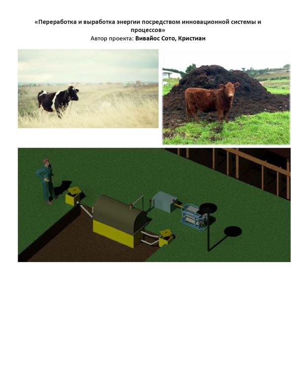 Ссылка на презентацию: I. Текущие проблемы на животноводческих фермах: Органические отходы предприятий животноводческого, сельскохозяйственного и агропродовольственного сектора (мелких, средних и крупных производителей) составляют 8-10% от массы каждой особи (в сутки у крупного рогатого скота). Отсутствие технологии и оборудования для переработки и утилизации отходов влечет за собой серьезные опасности: — Контаминация, связанная с риском для здоровья животных (вследствие воздействия и контакта с паразитическими микроорганизмами, бактериями, грибами и вирусами, летающими и ползающими насекомыми, грызунами, вызывающими инфекционные заболевания как у человека, так и у животных); — Загрязнение окружающей среды (почвы, воды и воздуха) из-за воздействия и контакта с некоторыми предыдущими организмами, а также с парниковыми газами CH4 и CO2, что может нанести экологический ущерб; — Без образования других производств, связанных с энергетикой, при которых отходы подвергаются классической обработке, не позволяющей их повторно использовать для получения энергии, такой как газ или электричество; — Эффективных решений не так много; другие системы управления/системы могут быть не такими эффективными, громоздкими, дорогостоящими и/или не приносящими экономической прибыльности для целей здравоохранения, экологии и/или энергетики; — Эффективность, высокая стоимость и низкая экономическая рентабельность переработки с использованием классических систем метантенка. Биогаз производят с типом фекалий крупного рогатого скота, при переработке 10 — 45 кг/день, можно получить биогаза 0,4-1 м3/день, а при 4 головах КРС можно обеспечить газом дом, в котором проживают 4 человека. Что касается электроэнергии, то с использованием обычного биогазового мото-генератора при предыдущих параметрах можно генерировать 0,3 — 3 кВтч/день, а при более высоких количествах биогаза можно получить 10 кВтч/день, необходимые для потребления электроэнергии в доме для 4 человек. II. Текущая ситуация, основные конкуренты/аналоги: 1. Классические системы метатенка: — Без мото-генераторов, биогаз производится и используется. Но не генерируют электроэнергию. Цена от ₽ 100.000 до ₽ 5.000.000 — Посредством обычных мото-генераторов вырабатываются электроэнергии (двигатели внутреннего сгорания, ДВС, с генератором, работающие на биогазе). Но им нужно много биогаза, вырабатывают мало электроэнергии и могут быть очень дорогими, в сравнении. Цена от ₽ 500.000 до ₽ 280.000.000. 2. При консервативном подходе к переработке и (или) утилизации органических отходов энергия не генерируется, а напротив, требуются её значительные затраты для осуществления различных манипуляций, к примеру: — Удаление твердых частиц. Цена от ₽ 100.000 до ₽ 1.000.000. — Компостирование. Цена от ₽ 100.000 до ₽ 10.000.000. — Вермикомпостирование и вермикультура. Цена от ₽ 100.000 до ₽ 10.000.000. — Очистка жидких промышленных органических отходов. Цена от ₽ 1.000.000 до ₽ 100.000.000. III. Преимущества выбранного технического решения: Мы разработали систему метантенка для переработки отходов и производства биогаза, исследовали более мощные машины, чтобы иметь возможность генерировать больше электроэнергии при аналогичных затратах, а также чтобы иметь возможность оптимизировать работу метантенка, повышая производительность, чтобы поддерживать здоровье 
