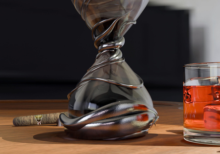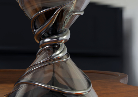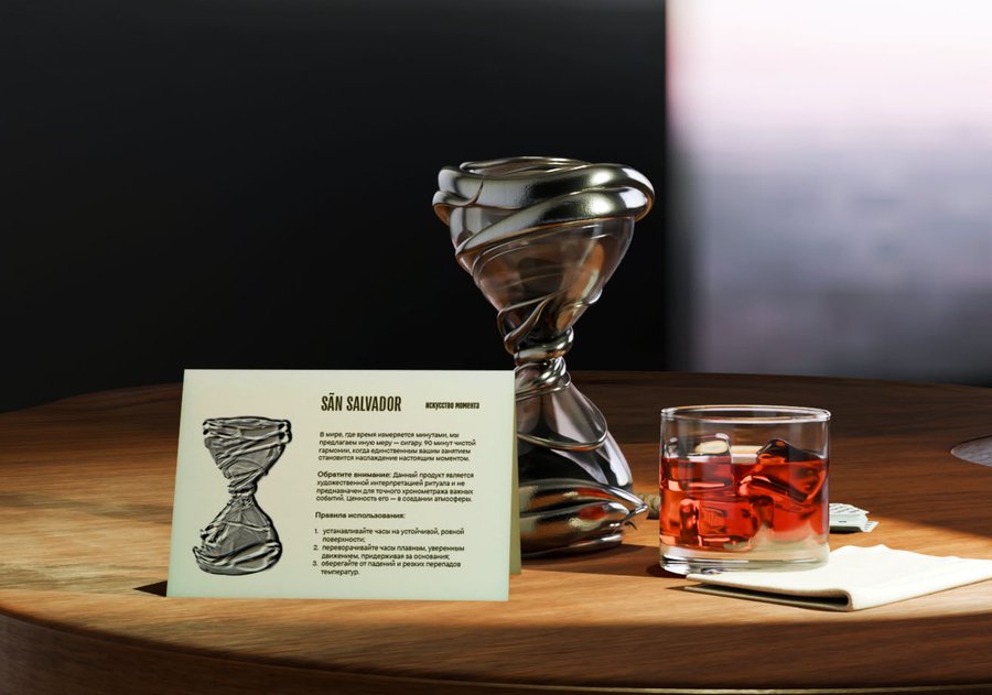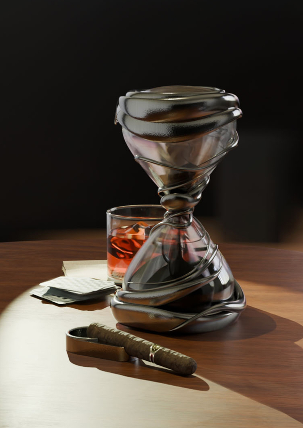 Серебряные завитки вокруг колбы, имитирующие застывший дым, напрямую отсылают к ритуалу курения, а продолжительность в 90 минут, равная времени курения сигары, превращает часы в метафору наслаждения моментом. Объект воплощает клубную культуру, создавая атмосферу релаксации в приватных пространствах.