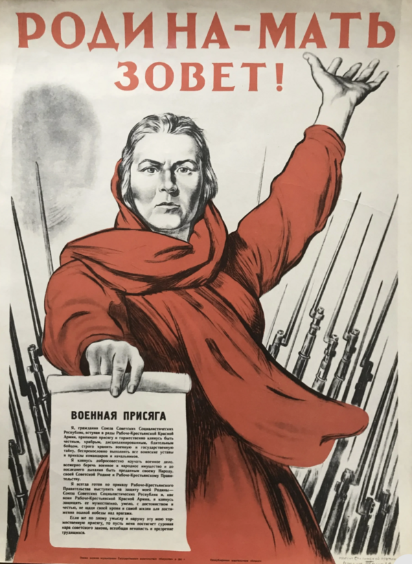 Во время Великой Отечественной войны плакат обретает особую эмоциональную силу. В нём появляется личность, не абстрактный герой, а живой человек, наделённый чувством долга и веры. Работы Ираклия Тоидзе, Виктора Иванова, Леонида Голованова и других художников становятся визуальными формулами мужества и стойкости, героизм здесь выражен не через драму, а через уверенность и достоинство.