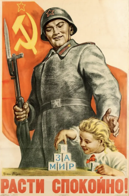 После победы образ героя трансформируется. Он остаётся символом силы, но теперь наполняется спокойствием и человечностью, плакаты послевоенных лет обращаются к темам восстановления, труда, семьи.
