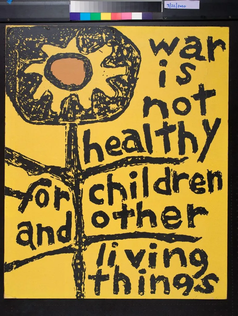 Визуальный язык протестов против войны во Вьетнаме развивался параллельно с эскалацией конфликта и изменениями в настроениях общества. В ранний период, доминировали пацифистские мотивы, вдохновленные контркультурой хиппи: знак мира, цветочные орнаменты, психоделические цвета и лозунги, провозглашающие любовь и гармонию. Эти элементы создавали оптимистичный образ, предлагая альтернативу милитаристской реальности.