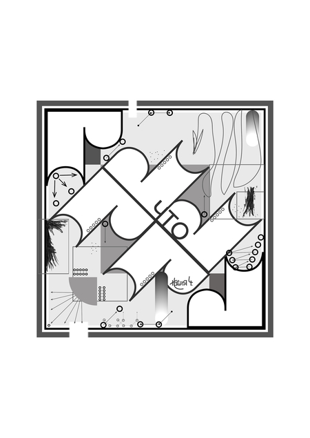 Платок «О5» — визуализация поиска причинно-следственных связей в обыденности. Он является частью серии из восьми векторных композиций, дополненных абстрактными пятнами туши, напечатанных на ткани.