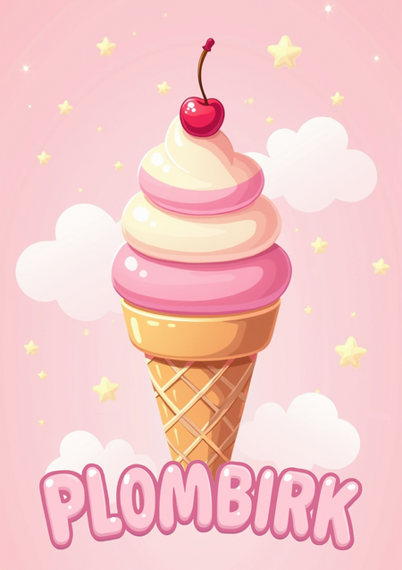 An ice cream kiosk with cute whimsical cartoon-style decor in the same style as a kawaii poster stands in the street of the city. Walls of kiosk have soft pink color with clouds and sparkles, like a dreamy candy land. The kiosk is small and charming, with a striped pastel awning, a sign that says «PLOMBIRK» in big rounded bubble letters. There is a display of ice cream cones with pastel strawberry and lavender colors on the roof of kiosk. Very clean, realistic, soft shading, high-quality style.